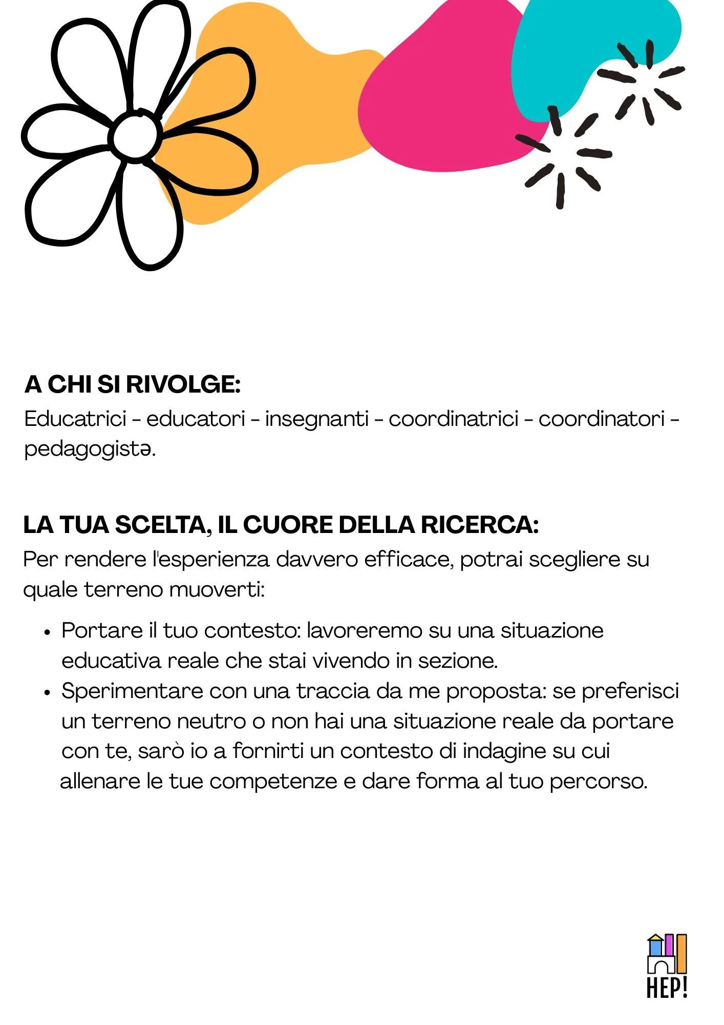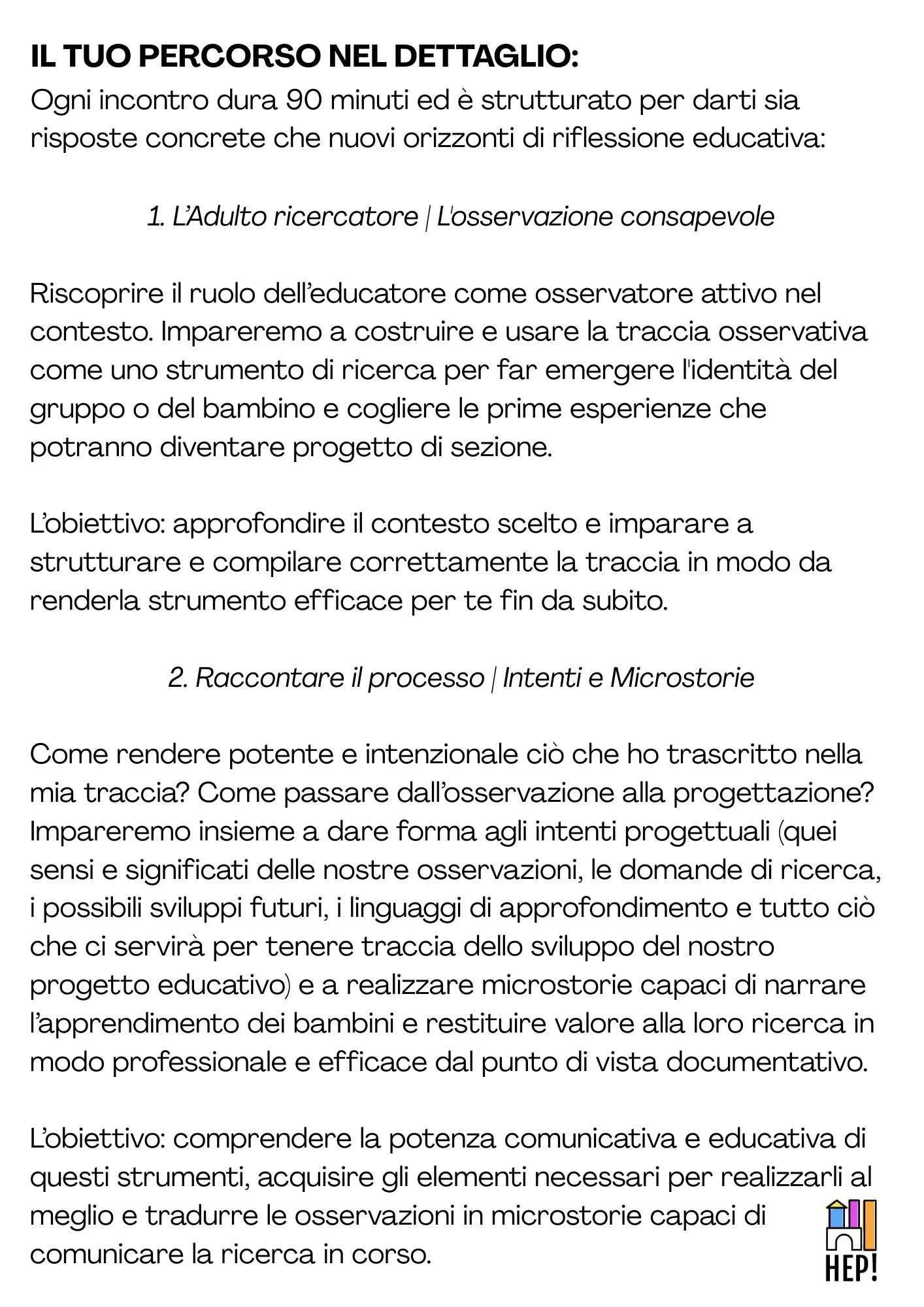 Ho ascoltato i vostri dubbi durante le consulenze e ho lavorato per mesi alla progettazione di questo nuovo percorso: uno spazio e un tempo dedicati alla formazione, tra teoria e pratica, per acquisire quegli strumenti capaci di accompagnarti nel tuo lavoro e di sostenerti nella realizzazione di un progetto educativo di qualità.